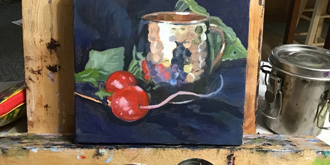 And finally, working on a small 6 x 6 oil on gallery canvas of a copper mug. Off to a good start but this copper mug is certainly a challenge. There are so many colors and reflections.