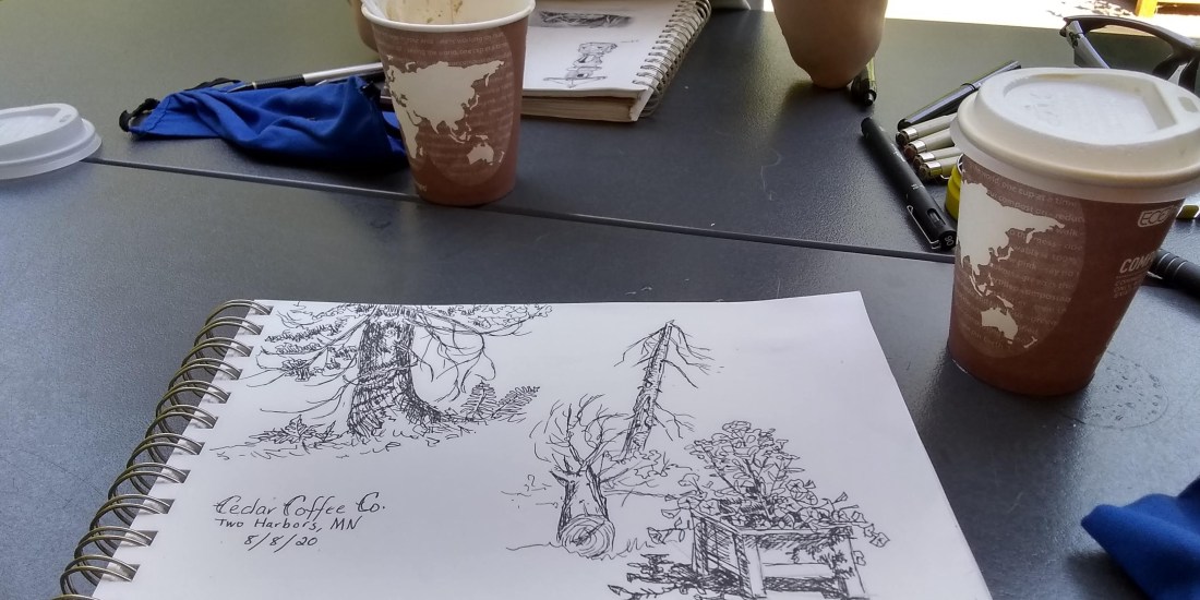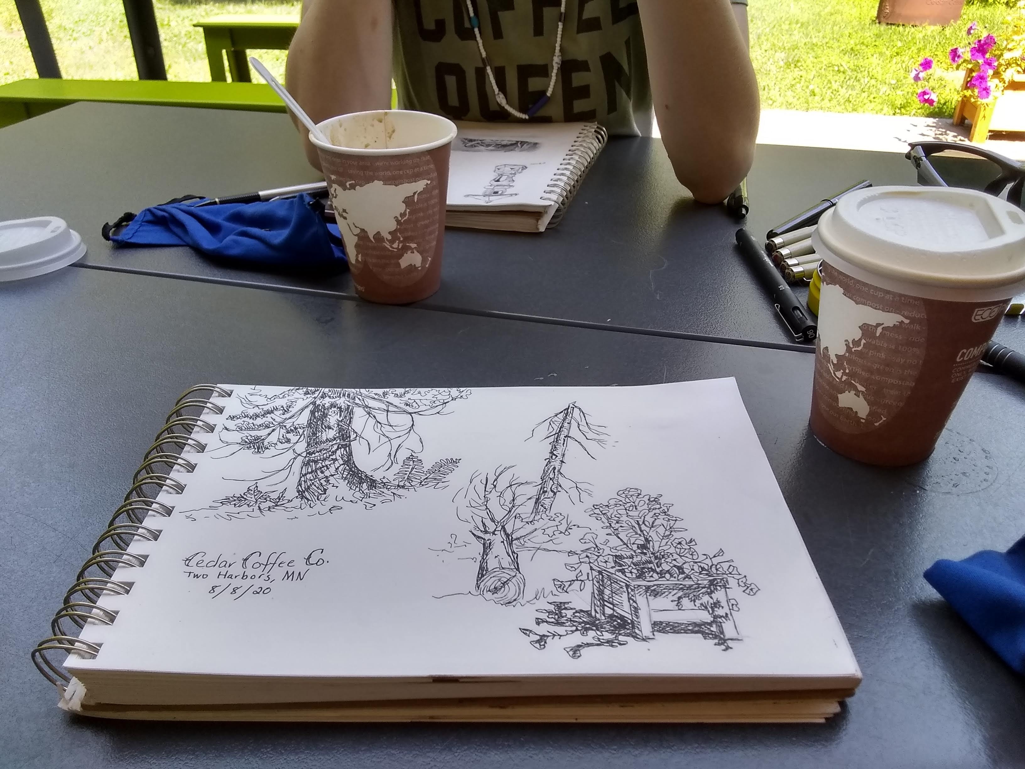 Went day tripping this morning to Two Harbors MN. Looked for agates on Stoney Point, stopped for lunch at Cedar Coffee Company. My daughter and I doodled in the shade while enjoying our Coffees.