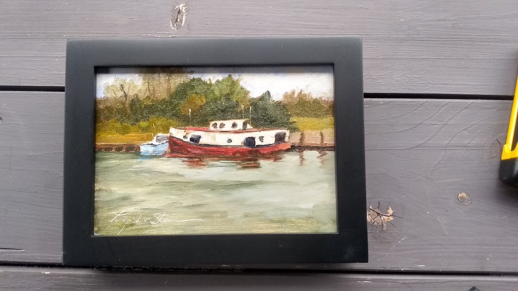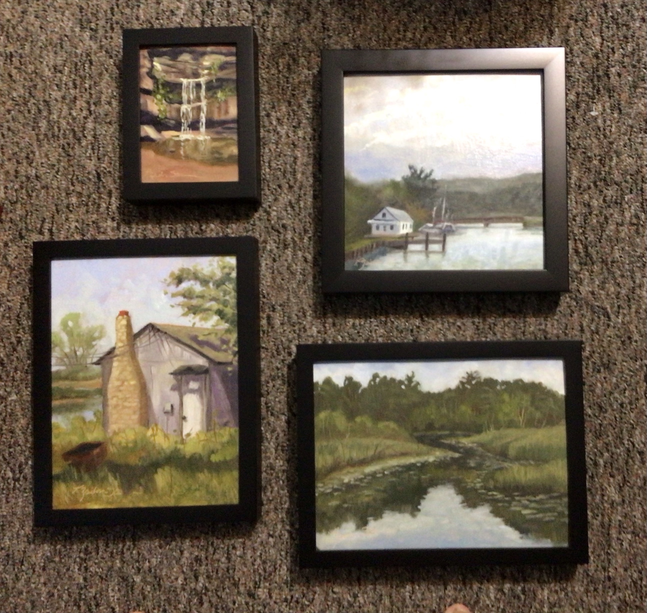Four of my completed Plein air paintings framed and ready to deliver to the check in.