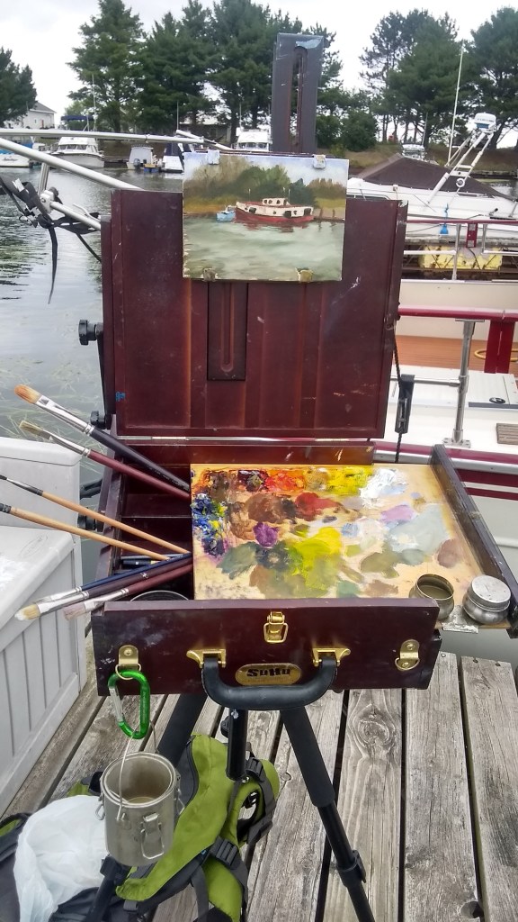 It rained into the late morning on the first day so I scouted the area and found some lunch in Cornucopia which consisted of some amazing smoked fish spread and crackers. Later when the rain let up, I painted near the boat launch. The pier I set up on rocked precariously as the wind picked up. One big gust took down my pochade box easel. The painting survived but my wash bucket spilled most of its contents.